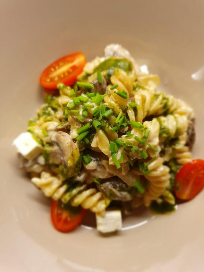 Ringla över pastan, servera med lite fetaost, körsbärstomater och slungad blandsallad.