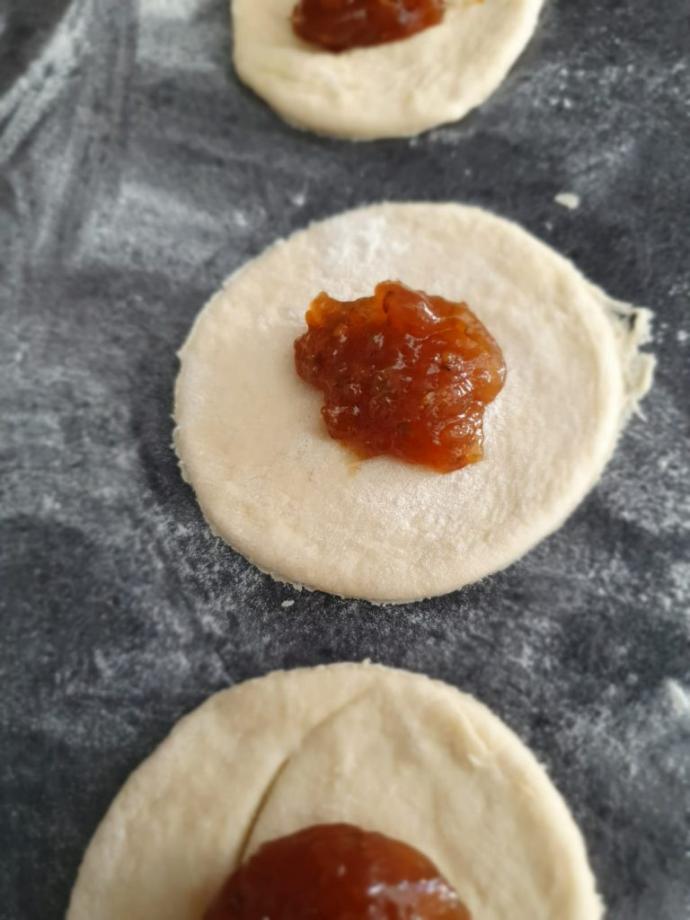 Fyll cirkeln med e hård ost eller en klick marmelad som tål värme, rulla ihop till en boll.